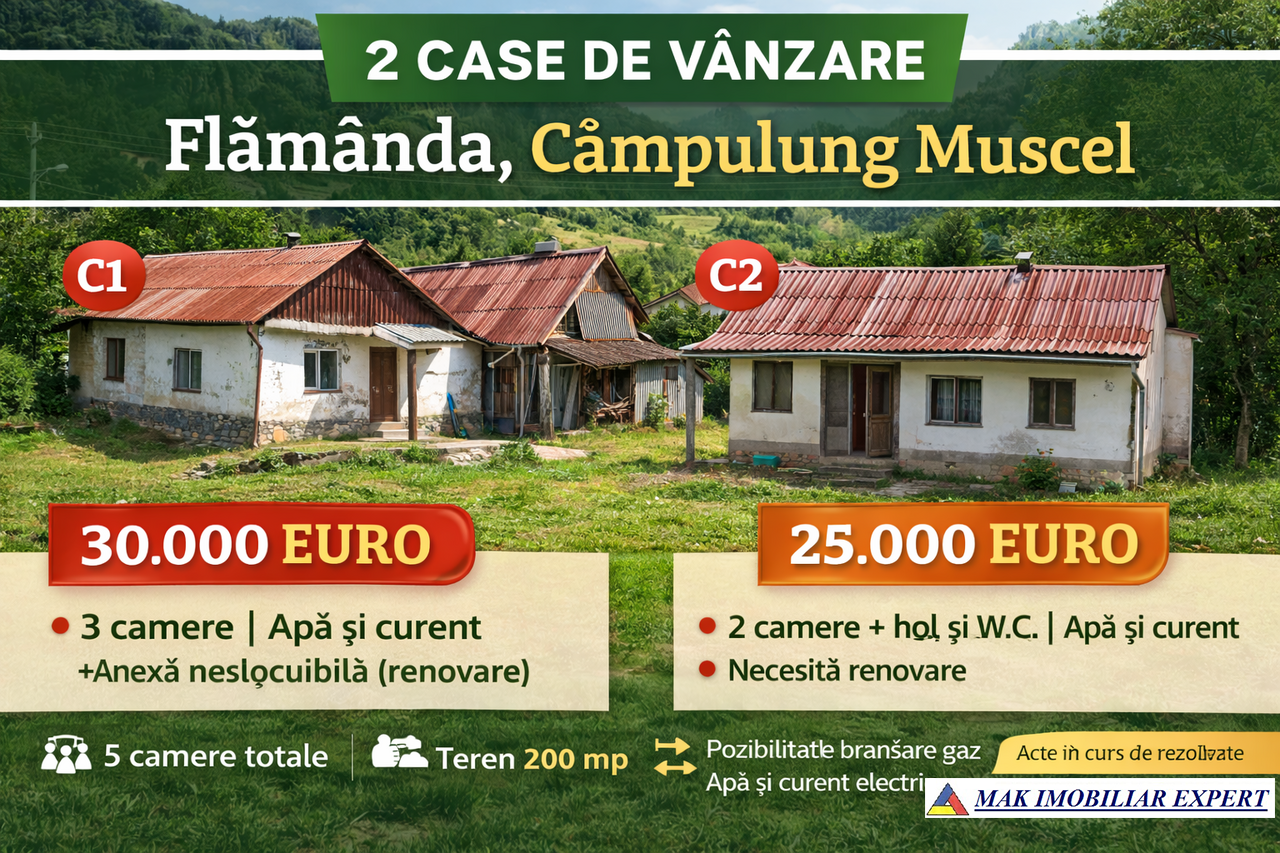 Două case de vânzare Flămânda Câmpulung Muscel, 5 camere total, teren 200 mp, utilități, ideal investiție, 55.000 euro.