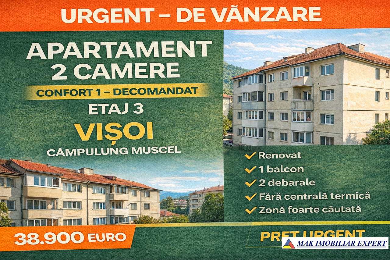 De vânzare URGENT apartament cu 2 camere, confort 1, decomandat, situat la etajul 3, în cartierul Vișoi, municipiul Câmpulung Muscel, județul Argeș.