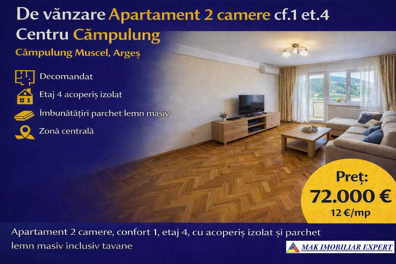 Apartament 2 camere, decomandat, confort 1, etaj 4, Centru Câmpulung Muscel. Acoperiș izolat, parchet lemn masiv. 72.000 €.