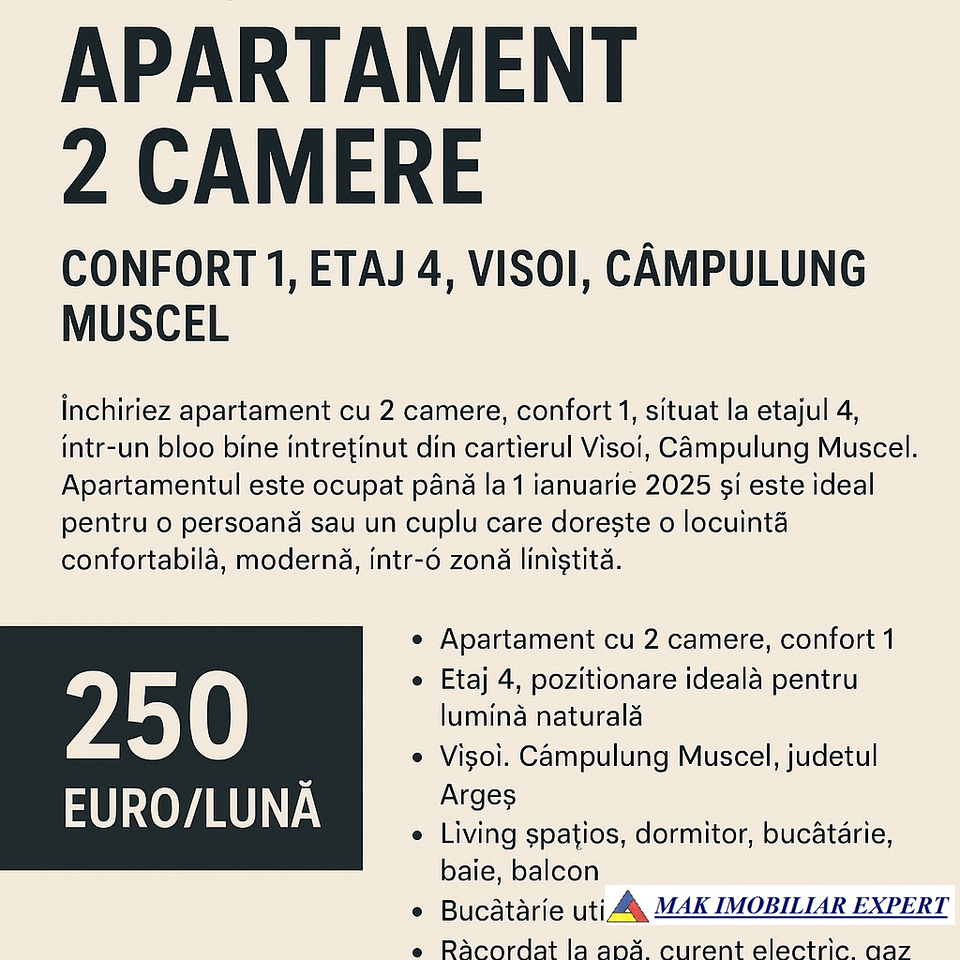 Închiriez apartament cu 2 camere, confort 1, situat la etajul 4, într-un bloc bine întreținut din cartierul Visoia, Câmpulung Muscel. Apartamentul este ocupat până la 1 ianuarie 2025 și este ideal pentru o persoană sau un cuplu care dorește o locuință confortabilă, modernă, într-o zonă liniștită.