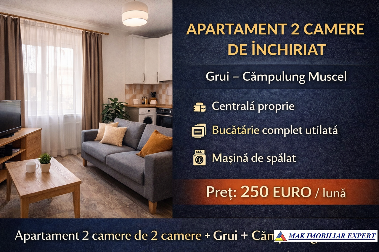 Apartament 2 camere de închiriat în Grui, Câmpulung Muscel. Centrală proprie, bucătărie utilată, mașină de spălat. Preț 250 euro.