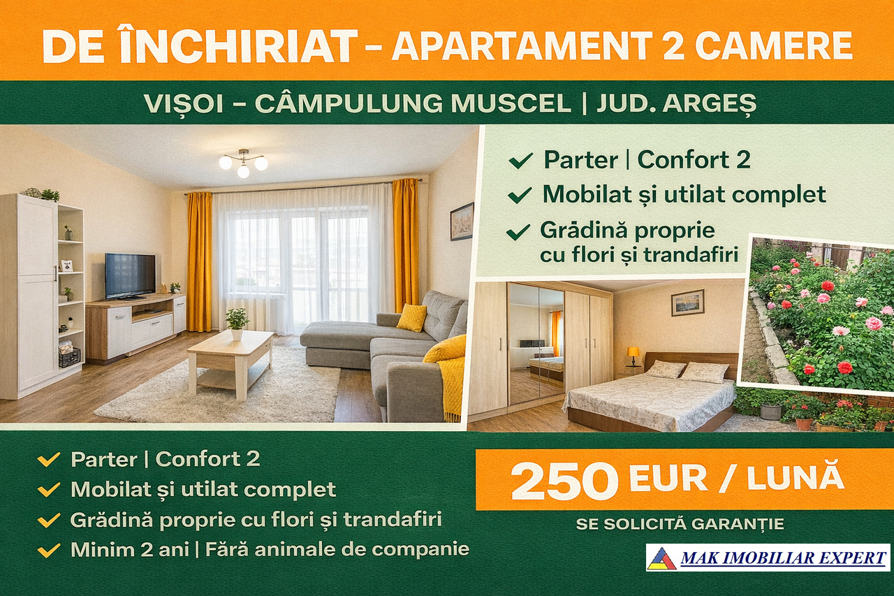 Apartament 2 camere cf 2 de închiriat, parter, Vișoi – Câmpulung Muscel, mobilat și utilat, grădină proprie. Chirie 250 €.