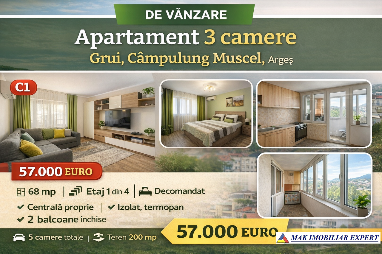 Apartament 3 camere de vânzare Grui Câmpulung, etaj 1, 68 mp, decomandat, centrală proprie, 2 balcoane, parcare.