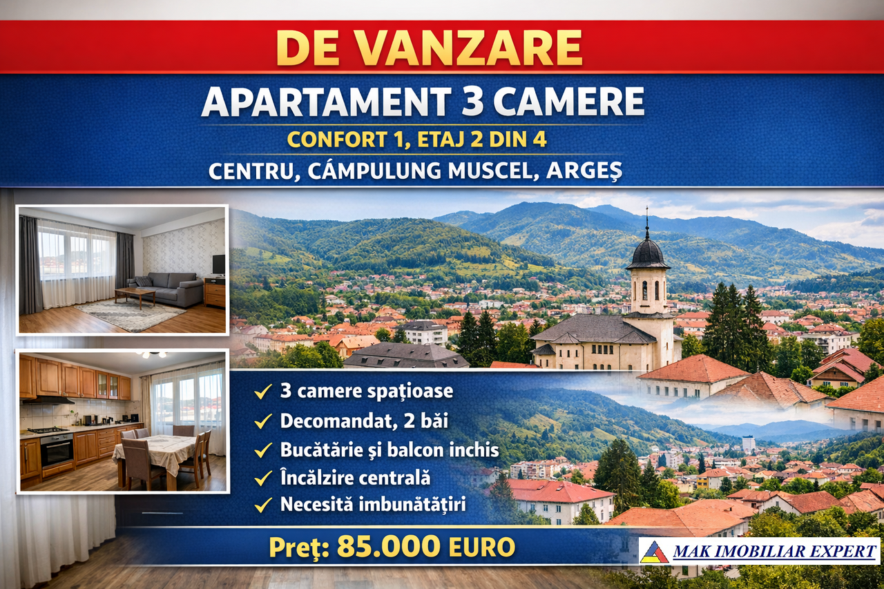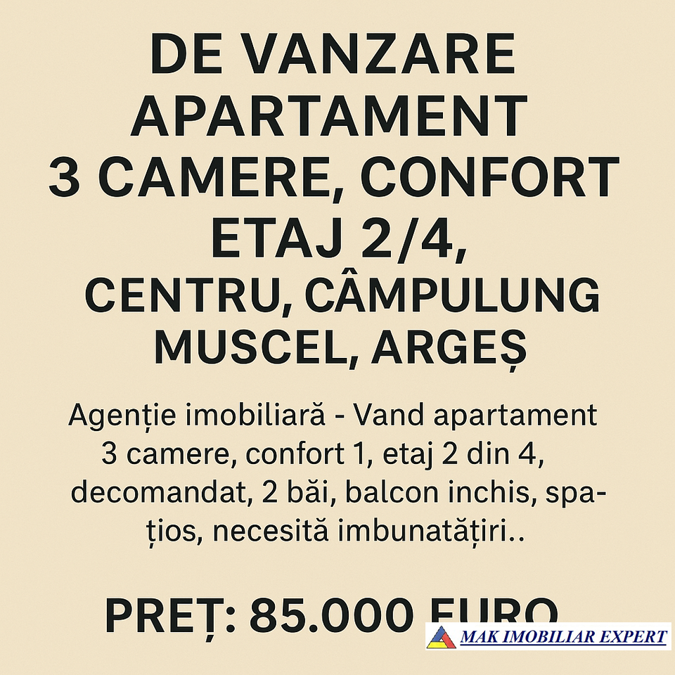 De vanzare: apartament 3 camere, confort 1, etaj 2/4, în Centru, Câmpulung Muscel. Ideal pentru familie sau cuplu, spațios necesita imbunatatiri.