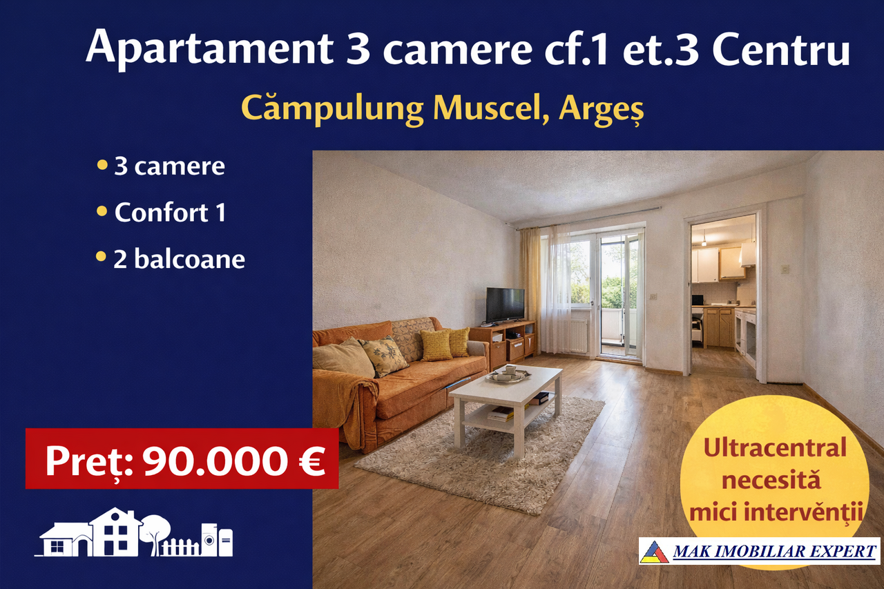 De vânzare apartament cu 3 camere, confort 1, situat la etajul 3, în zona centrală din Câmpulung Muscel, județul Argeș.