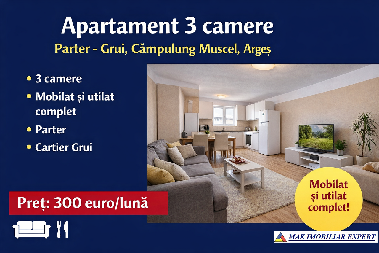 Închiriere apartament 3 camere, confort 1, parter, mobilat și utilat complet, în Grui, Câmpulung Muscel, Argeș. Preț 300 euro/lună.