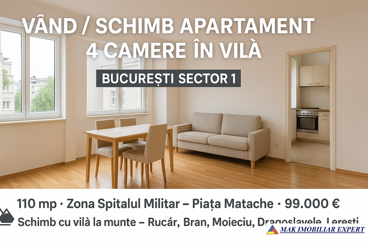 VAND / SCHIMB APARTAMENT 4 CAMERE IN VILA - Bucuresti Spitalul Militar si Piata Matache CU VILA LA MUNTE - RUCAR - BRAN - MOIECIU. Suprafata = 110 mp. Pret estimativ = 100000 euro. Vand sau schimb apartamentul de 4 camere in vila 2/3, ultracentral Spitalul Militar si Piata Matache. Apartamentul are 110 mp si multiple imbunatatiri, doua balcoane, parchet, centrala proprie, faianta, gresie, boxa la subsol si camera la mansarda, / Zona montana pooate fi extinsa: Dragoslavele, Leresti, etc. Doresc un schimb si diferenta se negociaza. Cu mentiunile ca doreste: sa schimbe sau sa vanda si sa primeasca diferenta de bani.