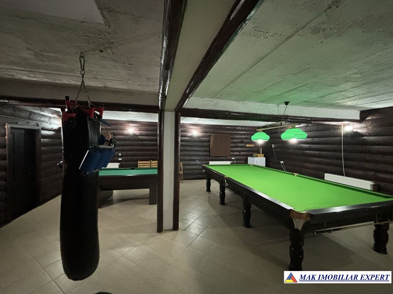 Subsolul este complet amenajat pentru relaxare, incluzând masă de snooker și biliard, fiind un spațiu perfect pentru socializare.