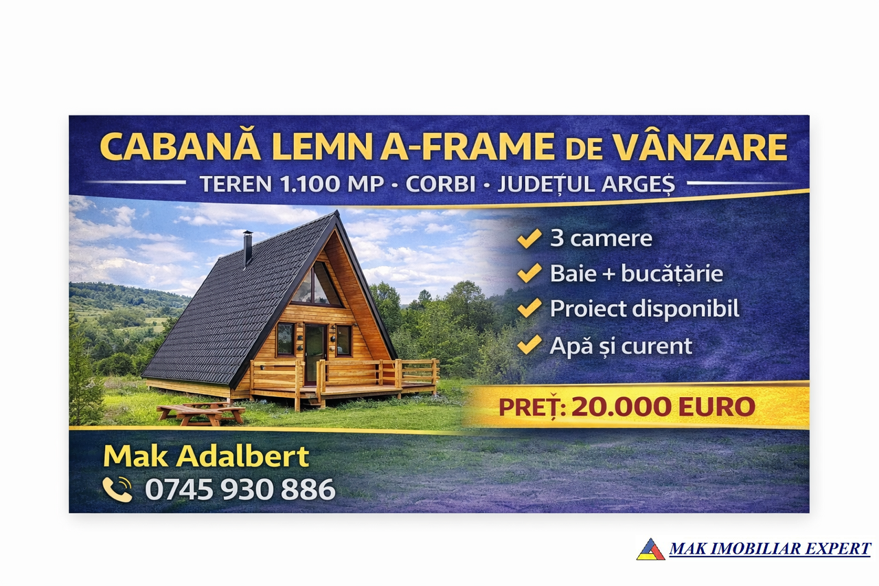 Va propunem spre vanzare o cabana din lemn tip A-frame, situata in localitatea Corbi, judetul Arges, intr-o zona naturala deosebita, ideala pentru relaxare sau investitie turistica.