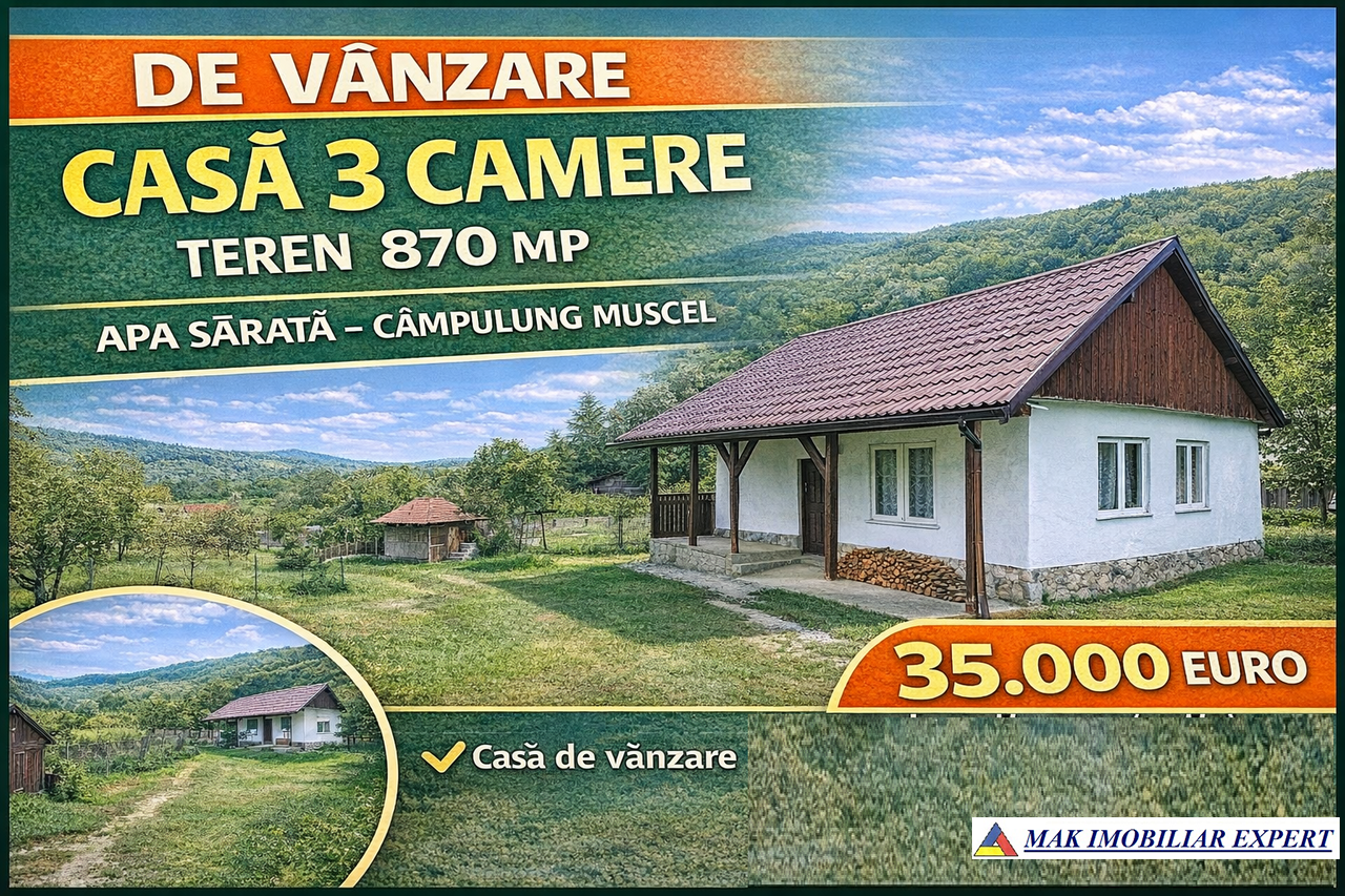 De vânzare casă cu 3 camere, situată în zona Apa Sărată, municipiul Câmpulung Muscel, județul Argeș, într-o zonă apreciată pentru liniște, aer curat și apropierea de natură.