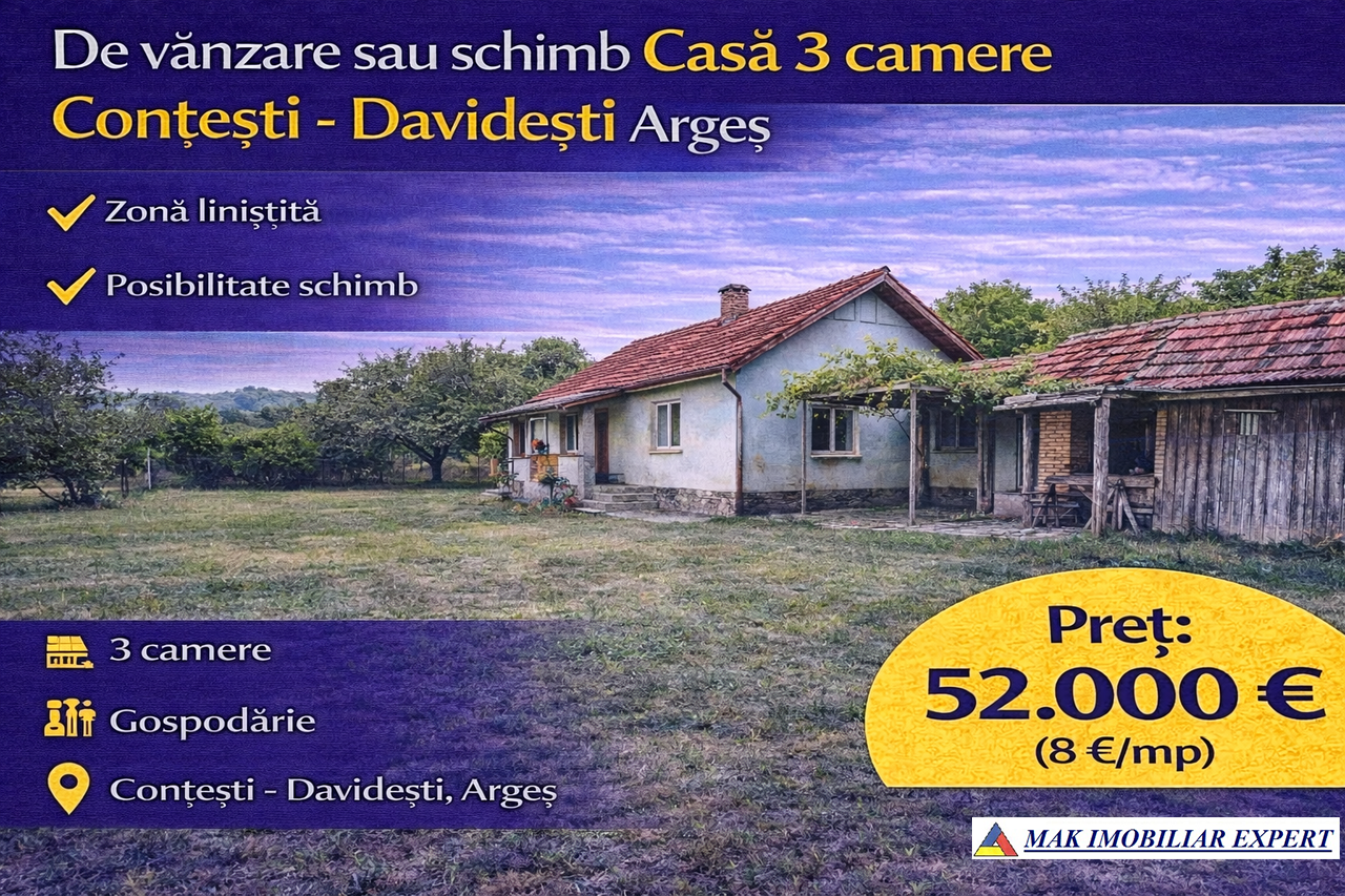 Casă 3 camere de vânzare sau schimb în Conțești – Davidești, Argeș. Gospodărie situată în zonă liniștită. 52.000 €.