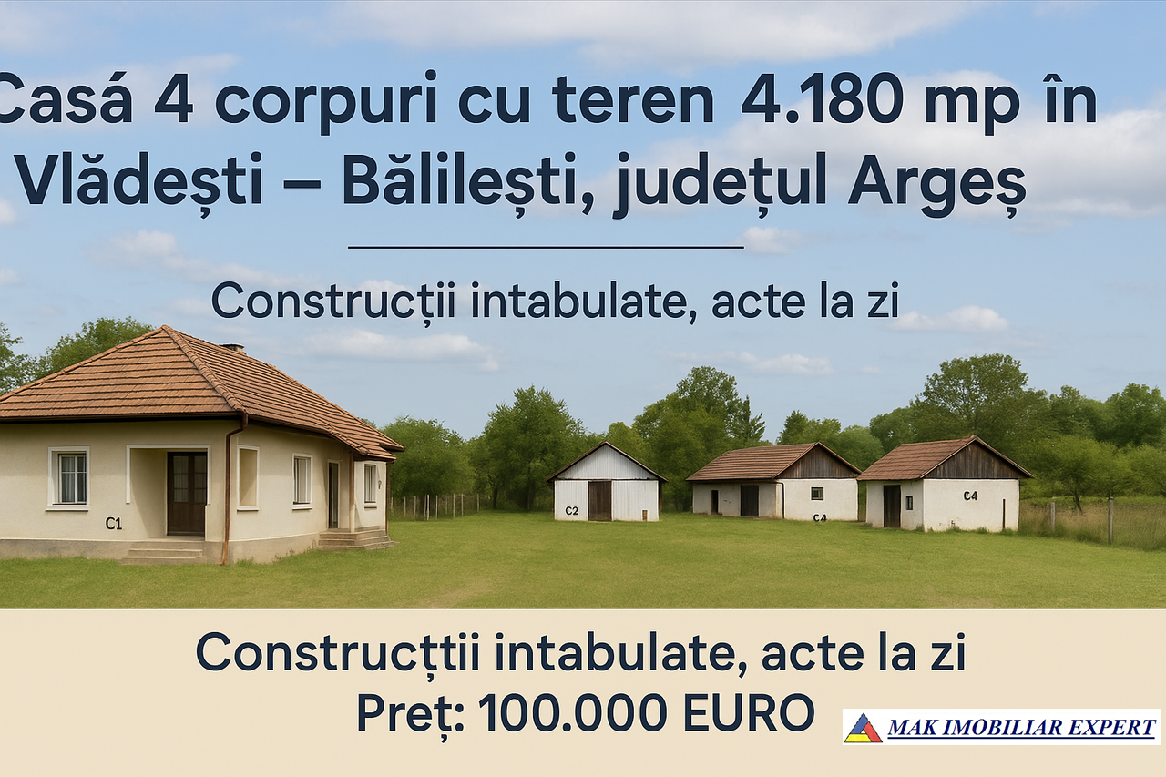 Casă 4 corpuri cu teren 4.180 mp în Vlădești – Balilesti, județul Argeș. Construcții intabulate, acte la zi