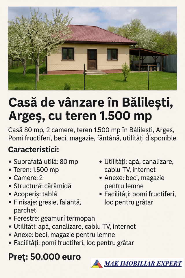 Oferim spre vânzare o casă situată în comuna Bălilești, județul Argeș, cu o suprafață de 80 mp și un teren aferent de 1.500 mp. Proprietatea este împrejmuită și dispune de numeroase facilități care o fac ideală pentru o locuință la țară.