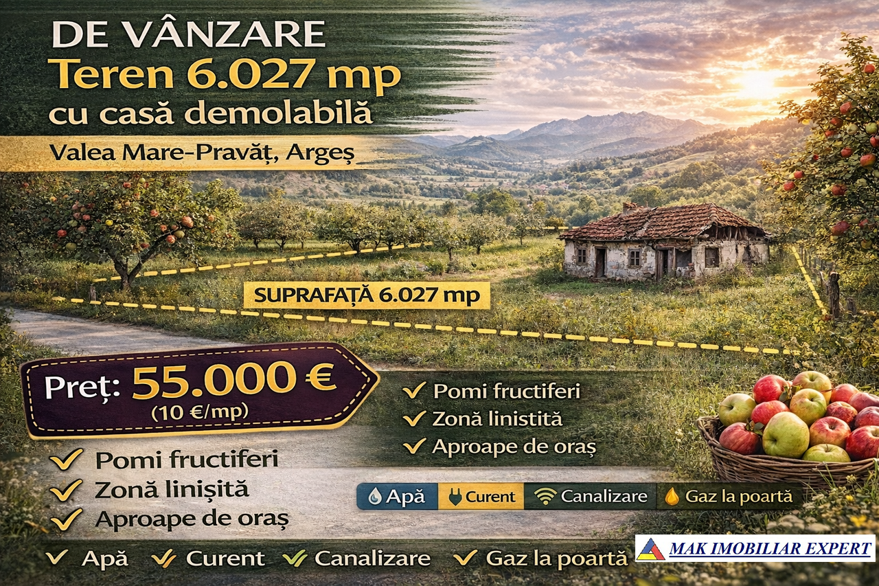 Teren 6.027 mp cu pomi fructiferi și casă demolabilă în Valea Mare-Pravăț, lângă Câmpulung Muscel. Utilități complete. Preț 55.000 €.