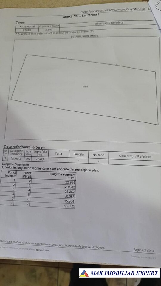 Proprietatea are o suprafață totală de 2.543 mp, cu o deschidere generoasă de 31,37 m la drumul asfaltat. Este intabulată, cu cadastru finalizat, având categoria de folosință „curți-construcții”, ceea ce permite construcția imediată.
