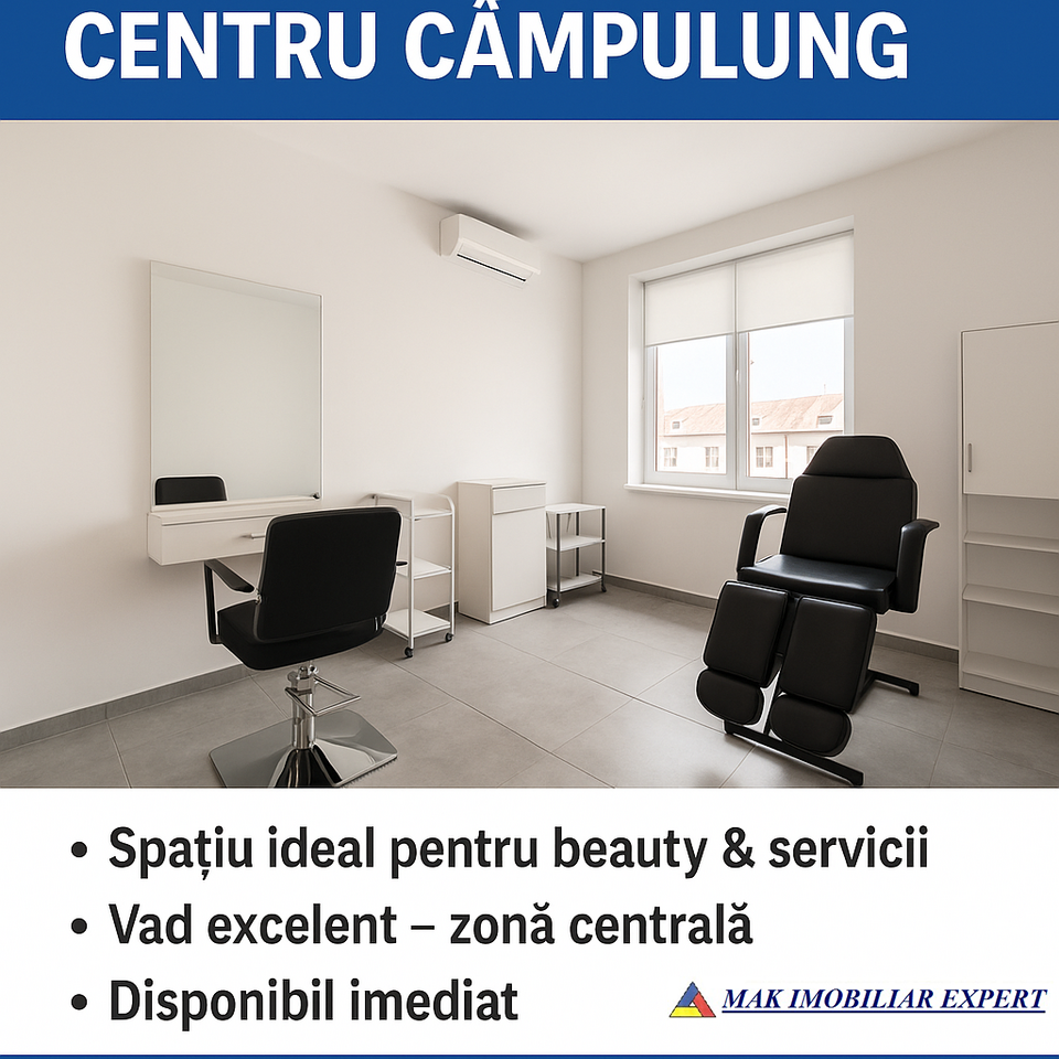 Salon comercial 25 mp de închiriat în centrul municipiului Câmpulung. Spațiu ideal pentru servicii beauty sau activități comerciale. Chirie: 700 €.