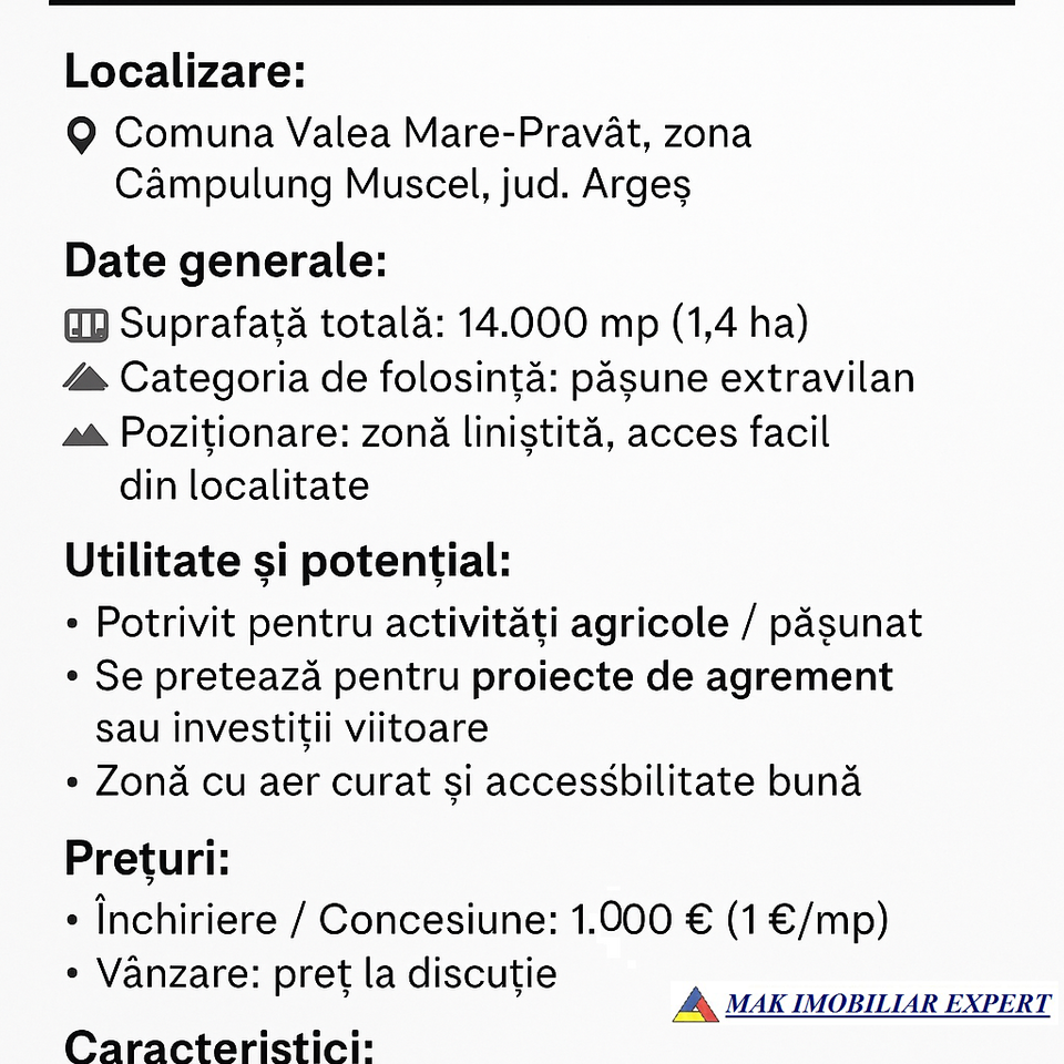 Disponibil pentru închiriere, concesionare sau vânzare, teren extravilan cu suprafața de 14.000 mp (1,4 ha), situat în comuna Valea Mare-Pravăț, zona Câmpulung Muscel, județul Argeș.