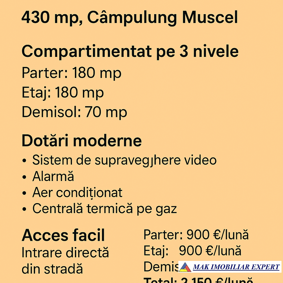 Spațiu birouri 430 mp în Câmpulung, compartimentat pe 3 nivele (180 mp + 180 mp + 70 mp). Dotări moderne, acces facil.