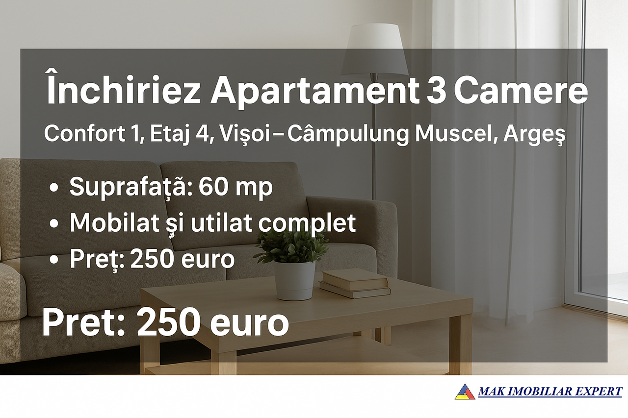 Închiriez apartament 3 camere, confort 1, situat la etajul 4 al unui bloc cu 4 niveluri, în cartierul Vișoi, Câmpulung Muscel, județul Argeș. Locuința are o suprafață totală de 60 mp și este complet mobilată și utilată, pregătită pentru mutare imediată.