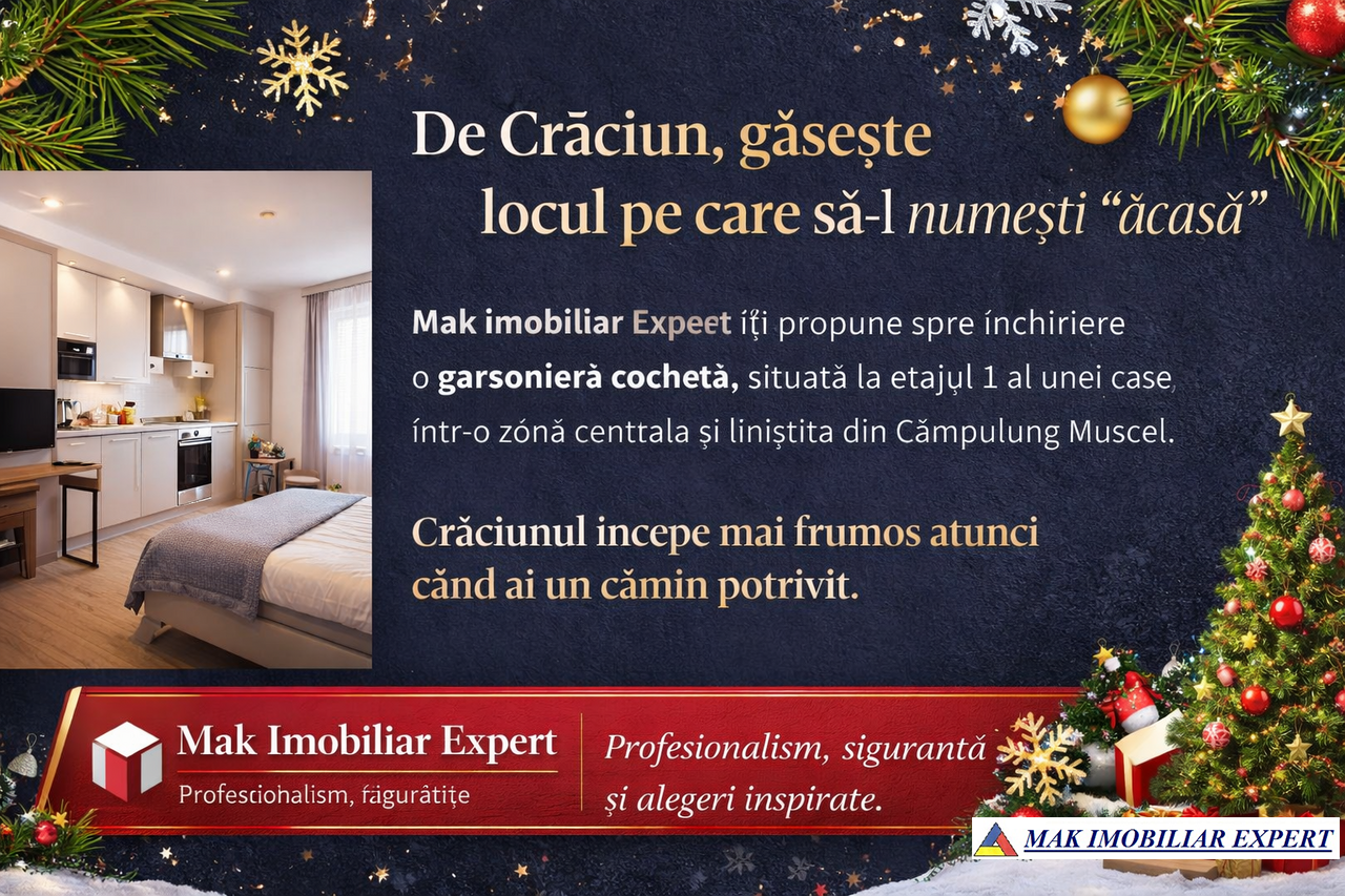 Garsonieră cf 1 de închiriat în Vișoi, Câmpulung Muscel. Etaj 1, 24 mp, mobilată, centrală proprie. Preț 300 euro.