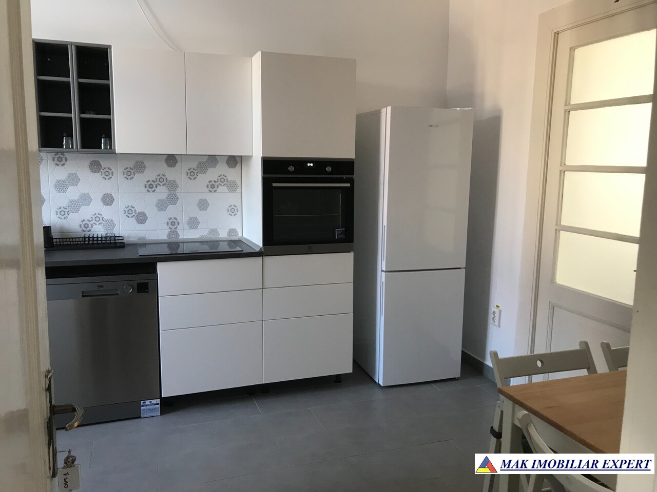 Bucătărie cu: plită, cuptor electric, hotă, frigider, mașină de spălat vase