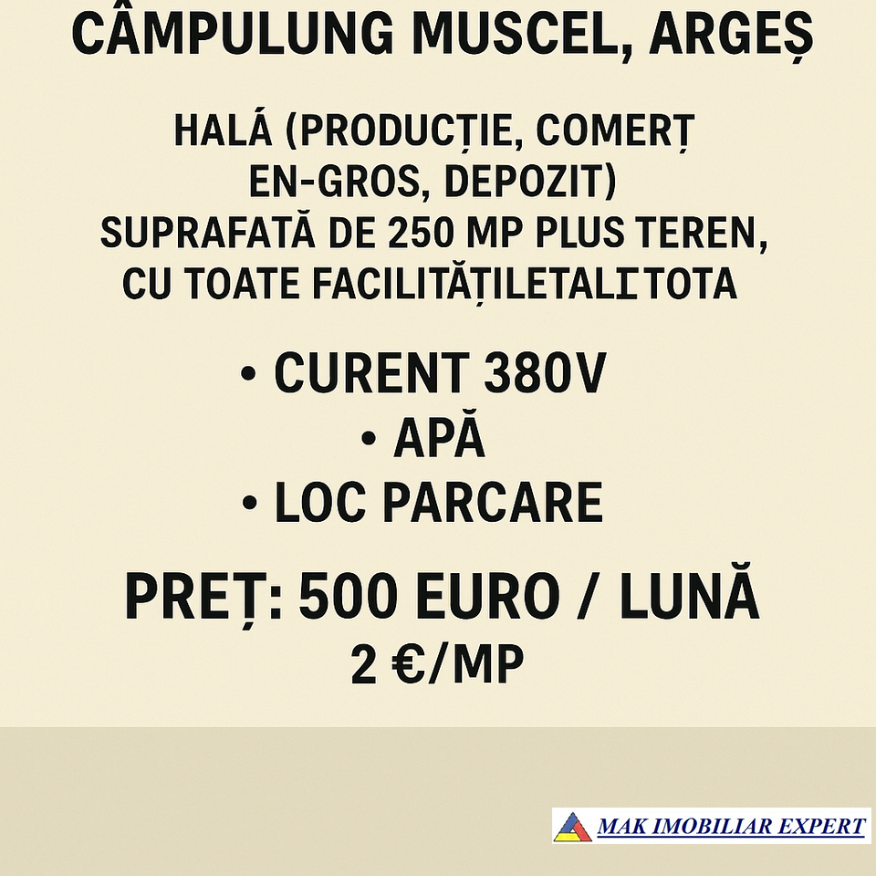 Închiriez hală cu suprafața de 250 mp, situată în Câmpulung Muscel, județul Argeș, într-o zonă comercială foarte accesibilă, potrivită pentru o gamă largă de activități:
