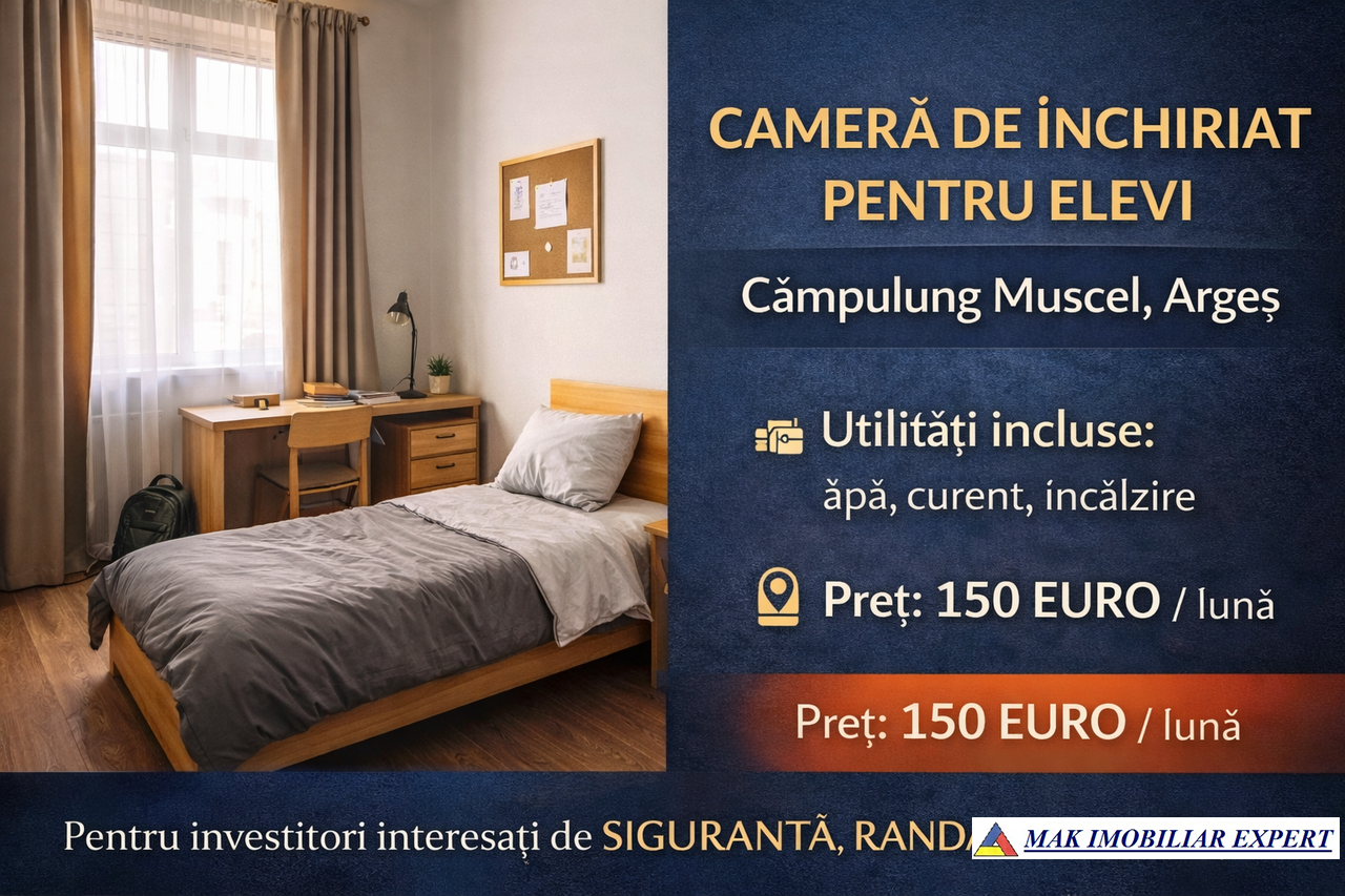Se oferă spre închiriere cameră pentru elev, situată în Câmpulung Muscel, într-o zonă accesibilă, potrivită pentru elevi care doresc un spațiu sigur și confortabil pe durata anului școlar.