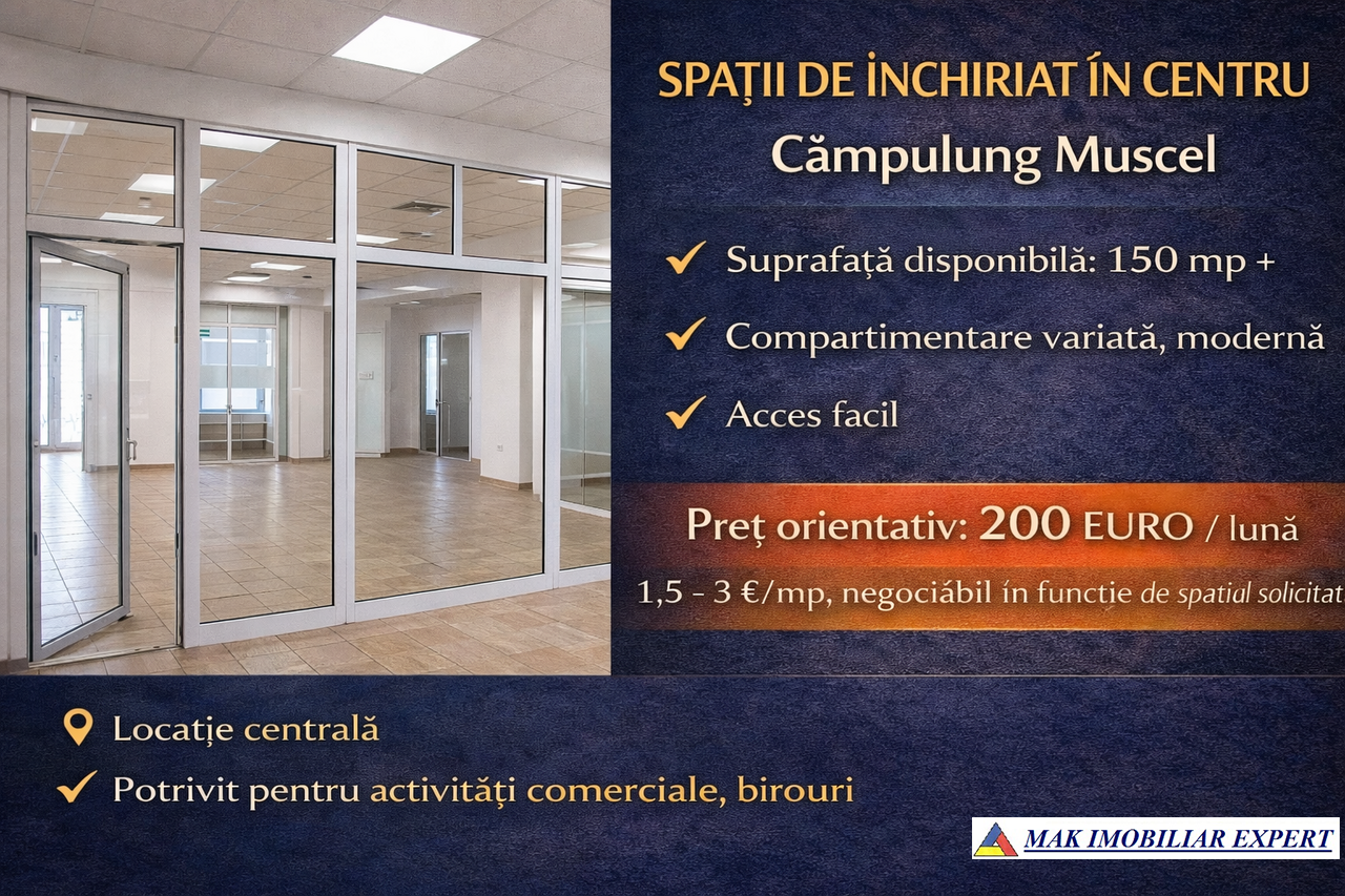 Spații de închiriat în centrul Câmpulung Muscel. Suprafețe variate, inclusiv 150 mp. Preț negociabil, 1,5–3 €/mp.