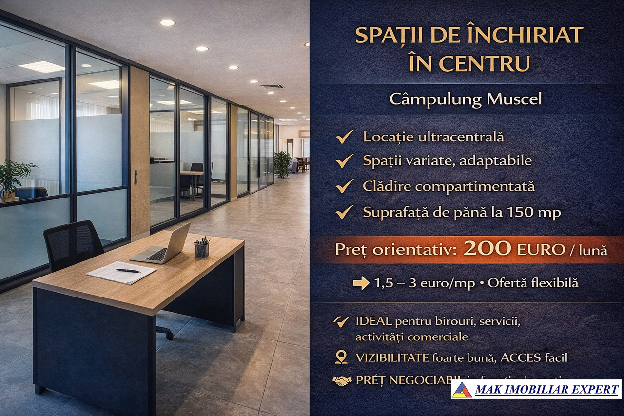 Se oferă spre închiriere spații comerciale / de birouri, situate în zona centrală a municipiului Câmpulung Muscel, într-o locație cu vizibilitate foarte bună și acces facil.