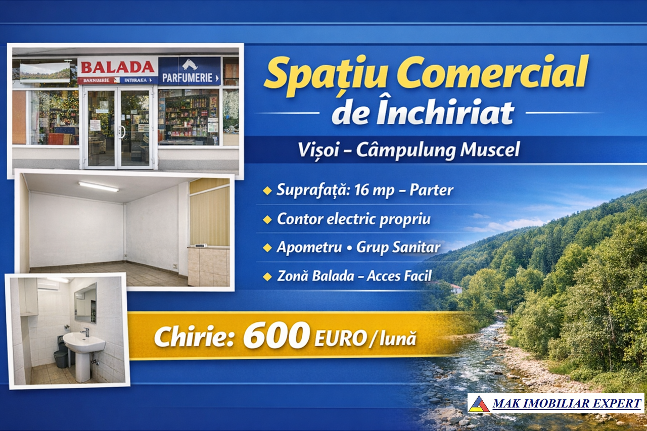De închiriat spațiu comercial cu suprafața de 16 mp, situat la parter, în zona Balada – Vișoi, din municipiul Câmpulung Muscel. Spațiul beneficiază de amplasare bună, cu acces facil pentru public, fiind potrivit pentru activități comerciale de mici dimensiuni sau servicii.