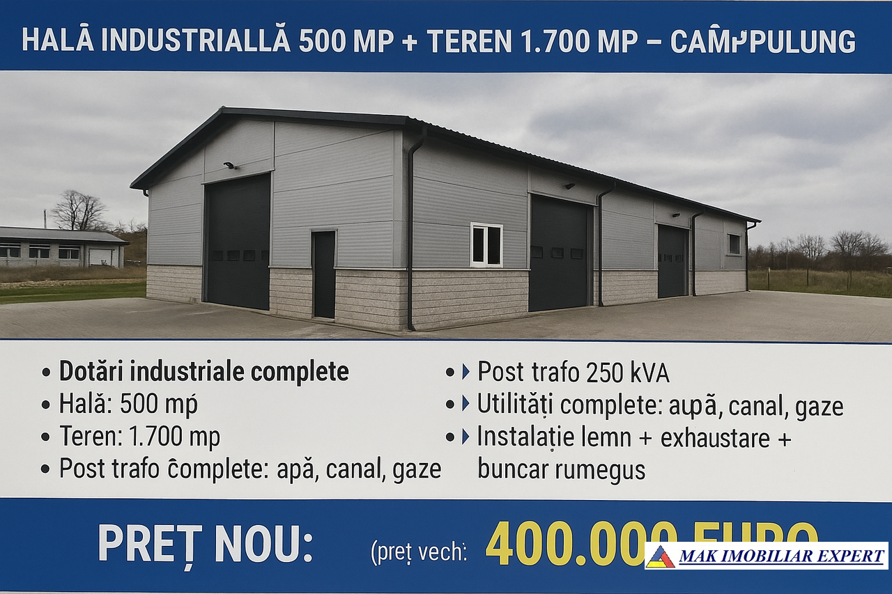 Hala industrială 500 mp + teren 1.700 mp în Câmpulung Muscel. Utilități complete, post trafo 250 kVA, dotări lemn. Preț redus: 400.000 euro.