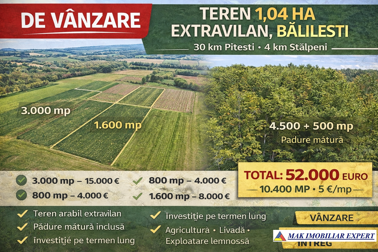 Se oferă spre vânzare teren extravilan în suprafață totală de 1,04 hectare (10.400 mp), situat în comuna Bălilești, județul Argeș, la aproximativ 30 km nord de Pitești și 4 km vest de Stâlpeni (DN Pitești – Câmpulung).