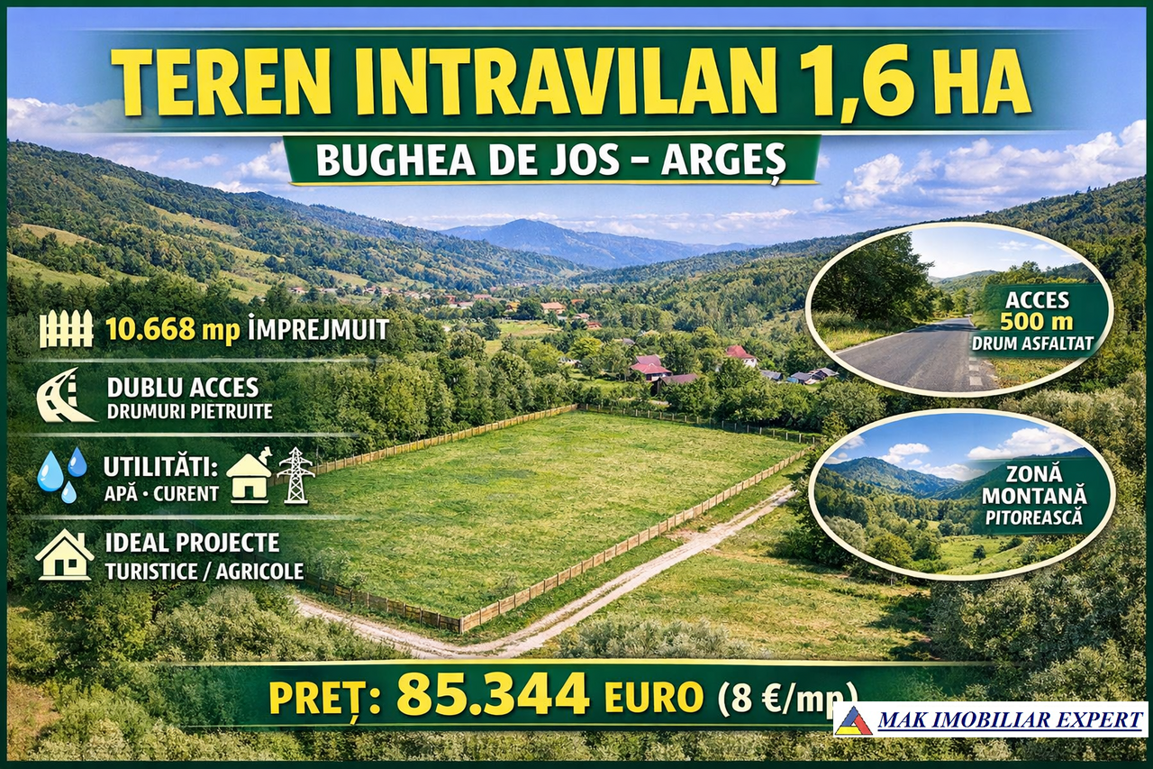De vânzare teren intravilan cu suprafața de 1,6 ha (10.668 mp), situat în Bughea de Jos, județul Argeș, într-o zonă montană pitorească, verde și foarte liniștită, cu potențial ridicat pentru dezvoltare.