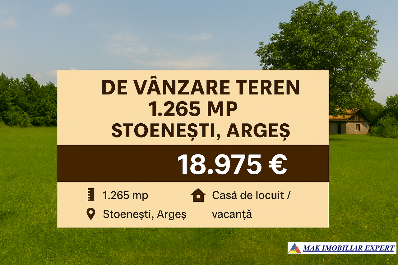 De vânzare: teren intravilan 1.265 mp, situat în Stoenești, Argeș. Ideal pentru construcție rezidențială sau casă de vacanță într-o zonă liniștită.