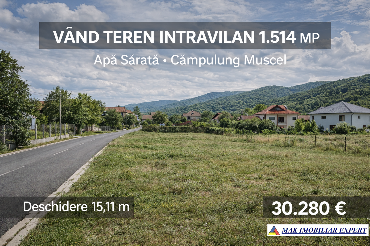 Teren intravilan 1.514 mp de vânzare în Apă Sărată, Câmpulung Muscel. Zonă rezidențială liniștită, front stradal 15,11 m. Preț 30.280 €.