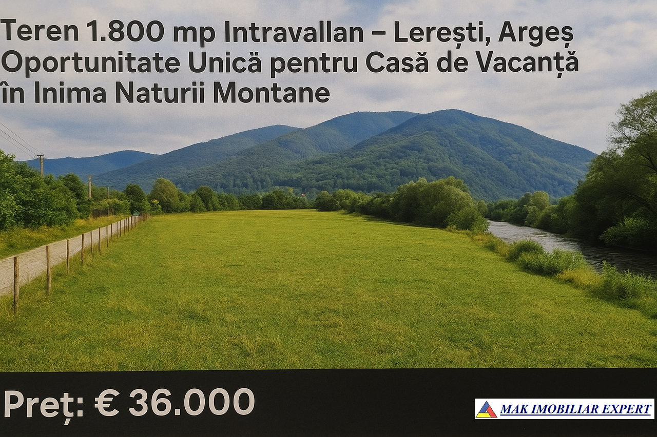 Meta Descriere: Teren intravilan de 1.800 mp în Lerești, Argeș, ideal pentru casă de vacanță, cu acces la utilități și râul din apropiere. Preț: €36.000.