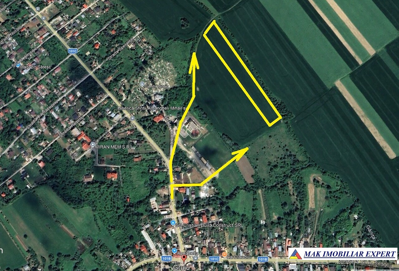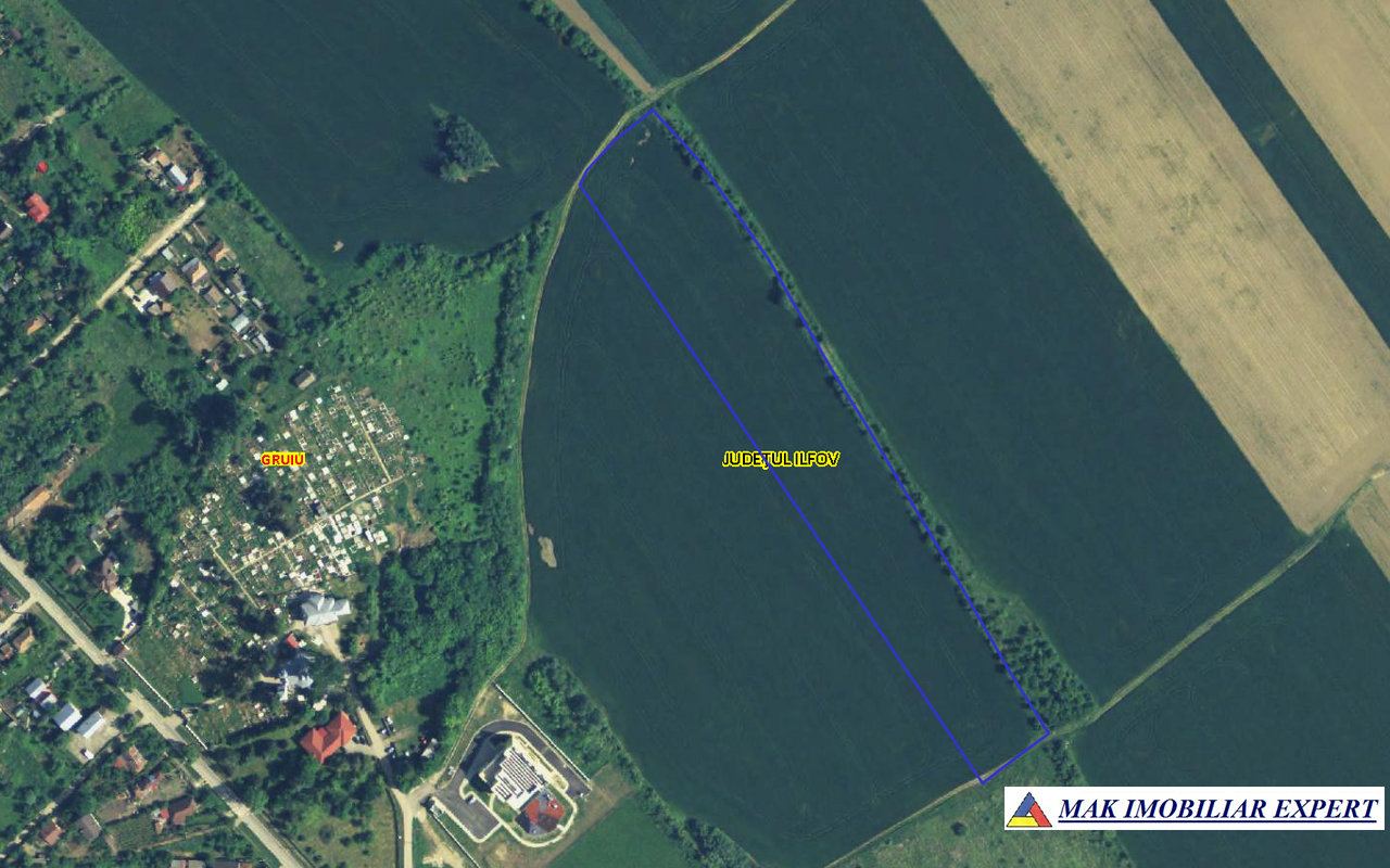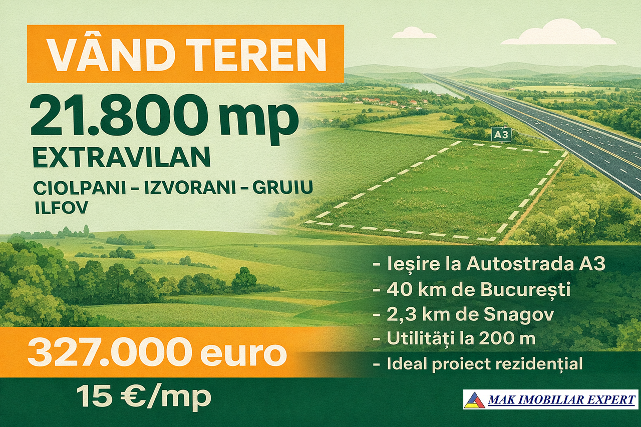De vânzare teren extravilan în suprafață totală de 2,18 ha (21.800 mp), situat în comuna Ciolpani, sat Izvorani, zona Gruiu, județul Ilfov, cu ieșire directă la Autostrada A3 București–Ploiești.