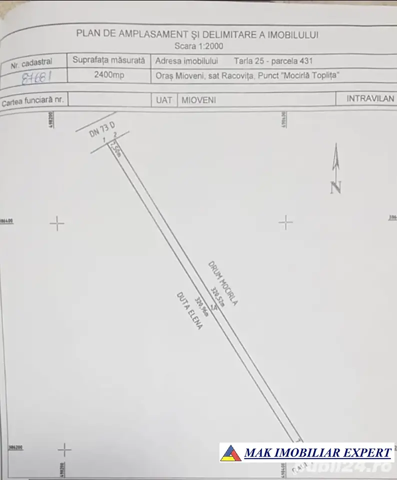De vânzare teren intravilan cu suprafața de 2.400 mp, situat în zona Haulote, pe direcția Mioveni – Davidești, județul Argeș.