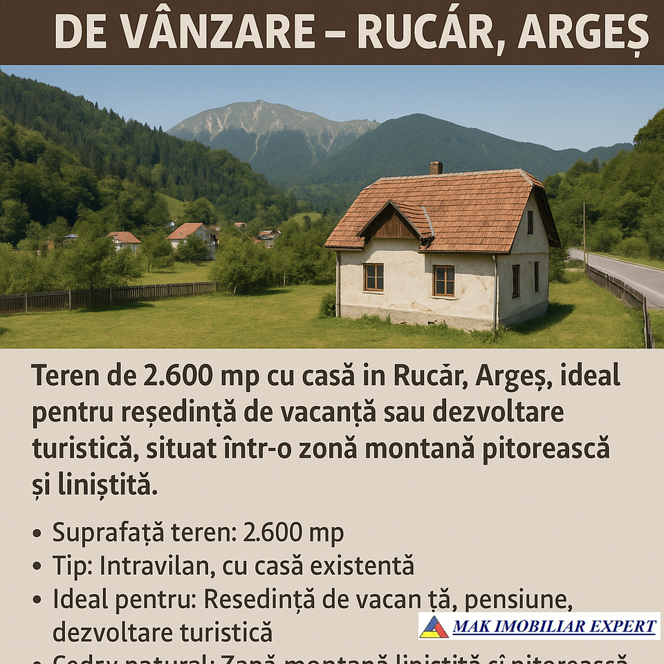 Meta Descriere: Teren de 2.600 mp cu casă în Rucăr, Argeș, ideal pentru reședință de vacanță sau dezvoltare turistică, situat într-o zonă montană pitorească și liniștită.