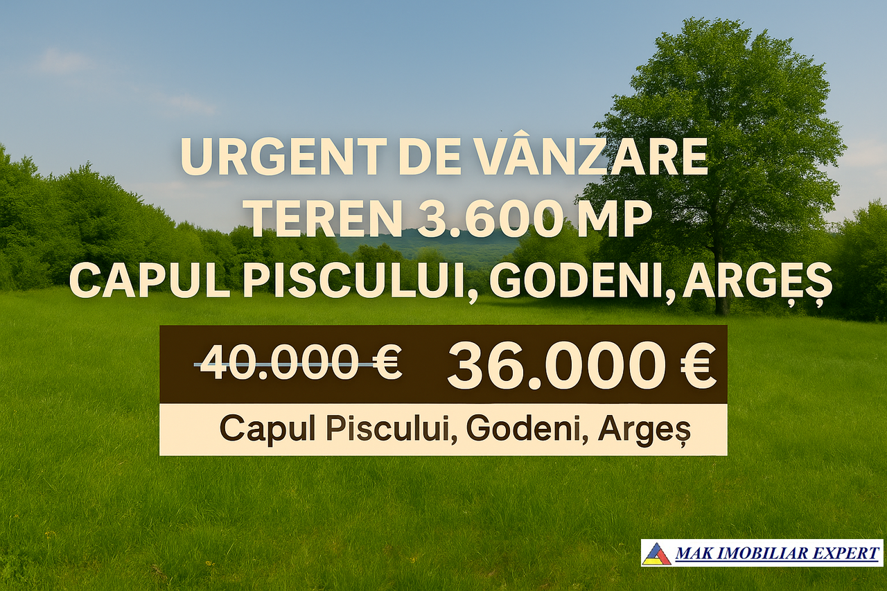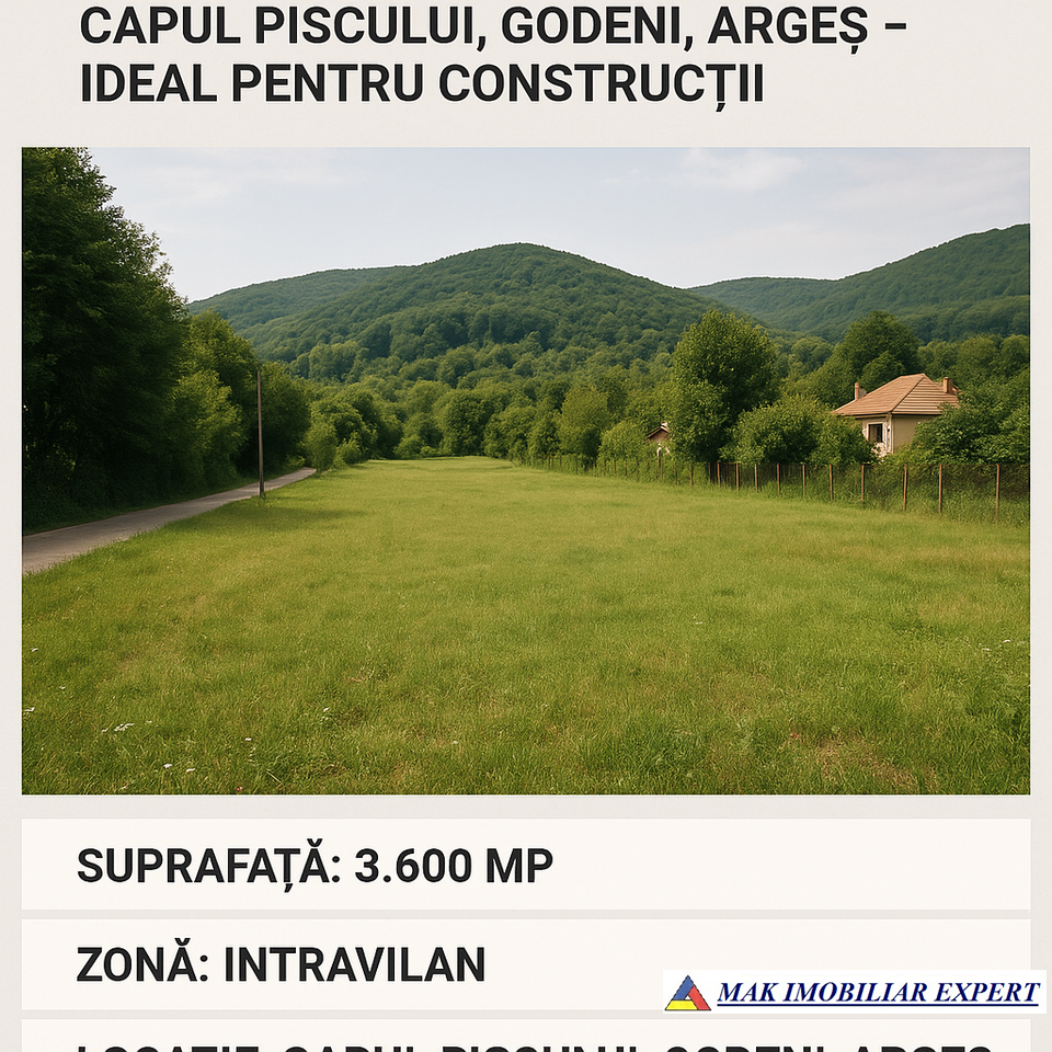 Meta Descriere: Teren intravilan de 3600 mp situat în Capul Piscului, Godeni, Argeș. Oportunitate excelentă pentru dezvoltări rezidențiale într-o zonă liniștită. Detalii complete pe site.