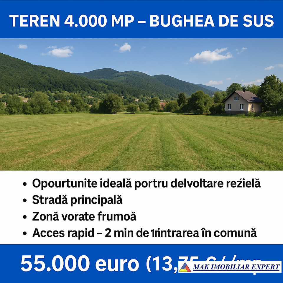 Meta Descriere: Teren de 4.000 mp situat în Bughea de Sus, perfect pentru proiecte de construcții sau dezvoltări imobiliare. Oportunitate excelentă de investiție într-o zonă naturală și liniștită. Detalii complete pe site.