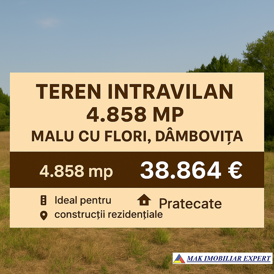 Teren intravilan de 4.858 mp situat în Malu cu Flori, Dâmbovița, ideal pentru construcții rezidențiale sau investiții imobiliare. Zonă liniștită și accesibilă, perfectă pentru o locuință de vacanță sau reședință permanentă.