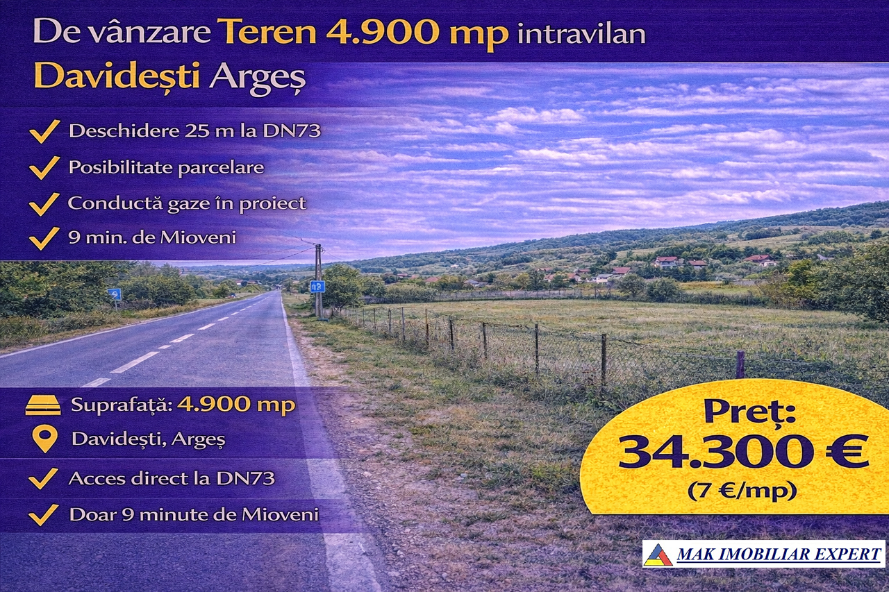 De vânzare teren intravilan cu suprafața de 4.900 mp, situat în comuna Davidești, județul Argeș, cu acces direct la DN73.