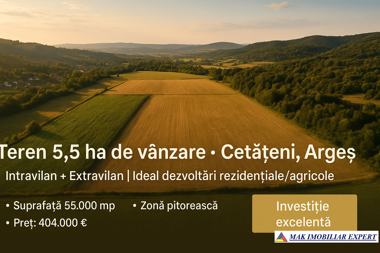 Meta Descriere: Teren de 5,5 ha situat în Cetățeni, Argeș, cu utilizare mixtă (intravilan/extravilan), perfect pentru dezvoltări rezidențiale sau activități agricole. Oportunitate excelentă de investiție într-o zonă naturală și liniștită. Detalii complete pe site.