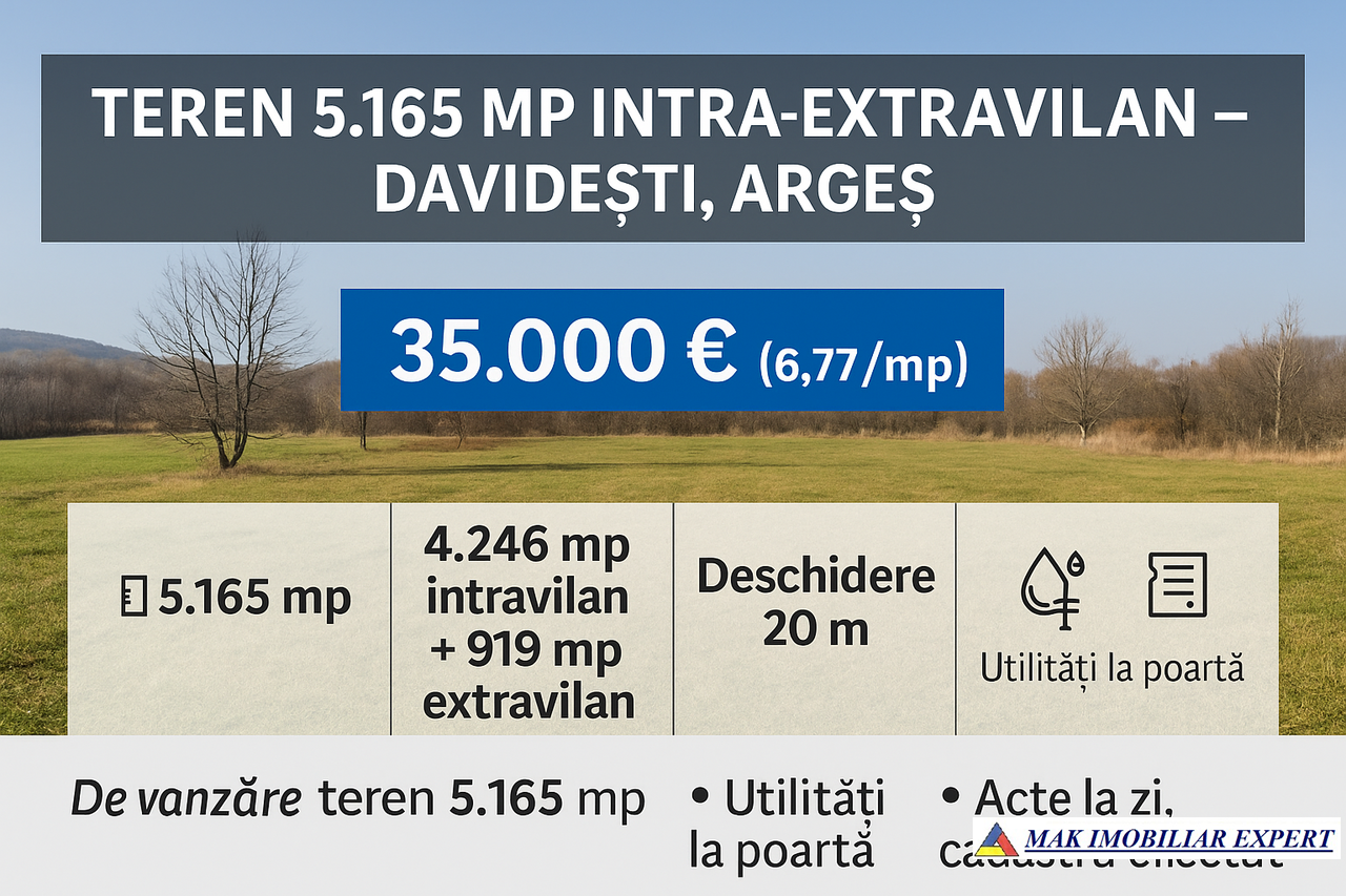 De vânzare teren cu suprafața totală de 5.165 mp (4.246 mp intravilan și 919 mp extravilan), situat în comuna Davidești, sat Voroveni, punctul Brădoaia, pe DN 73D, capăt de linie autobuz Mioveni – Davidești.