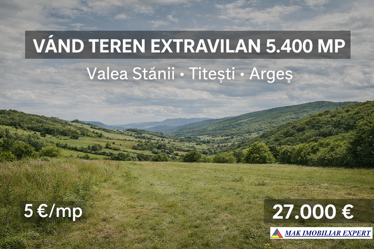 De vânzare teren extravilan cu suprafața de 5.400 mp, situat în satul Valea Stânii, comuna Titești, județul Argeș, într-o zonă liniștită, cu cadru natural plăcut și acces facil.