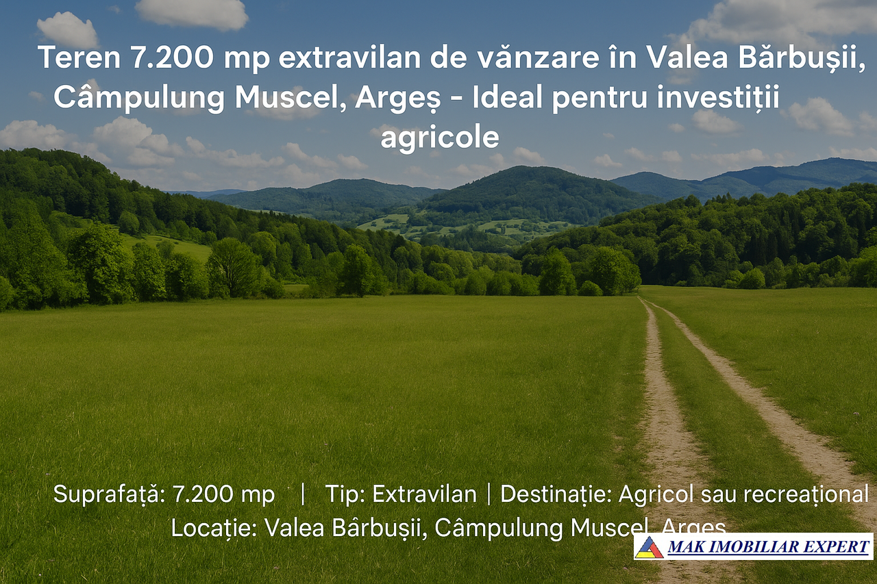 Acest teren extravilan de 7.200 mp în Valea Bărbușii, Câmpulung Muscel, este potrivit pentru agricultură sau activități recreaționale. Locația oferă acces facil și peisaje naturale liniștite, fiind o oportunitate excelentă de investiție.