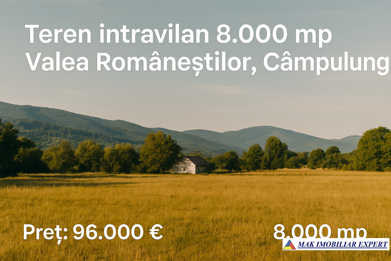 Teren intravilan 8.000 mp în Valea Româneștilor, Câmpulung Muscel. Zonă liniștită, ideal pentru investiții sau construcții. Preț 96.000 €.