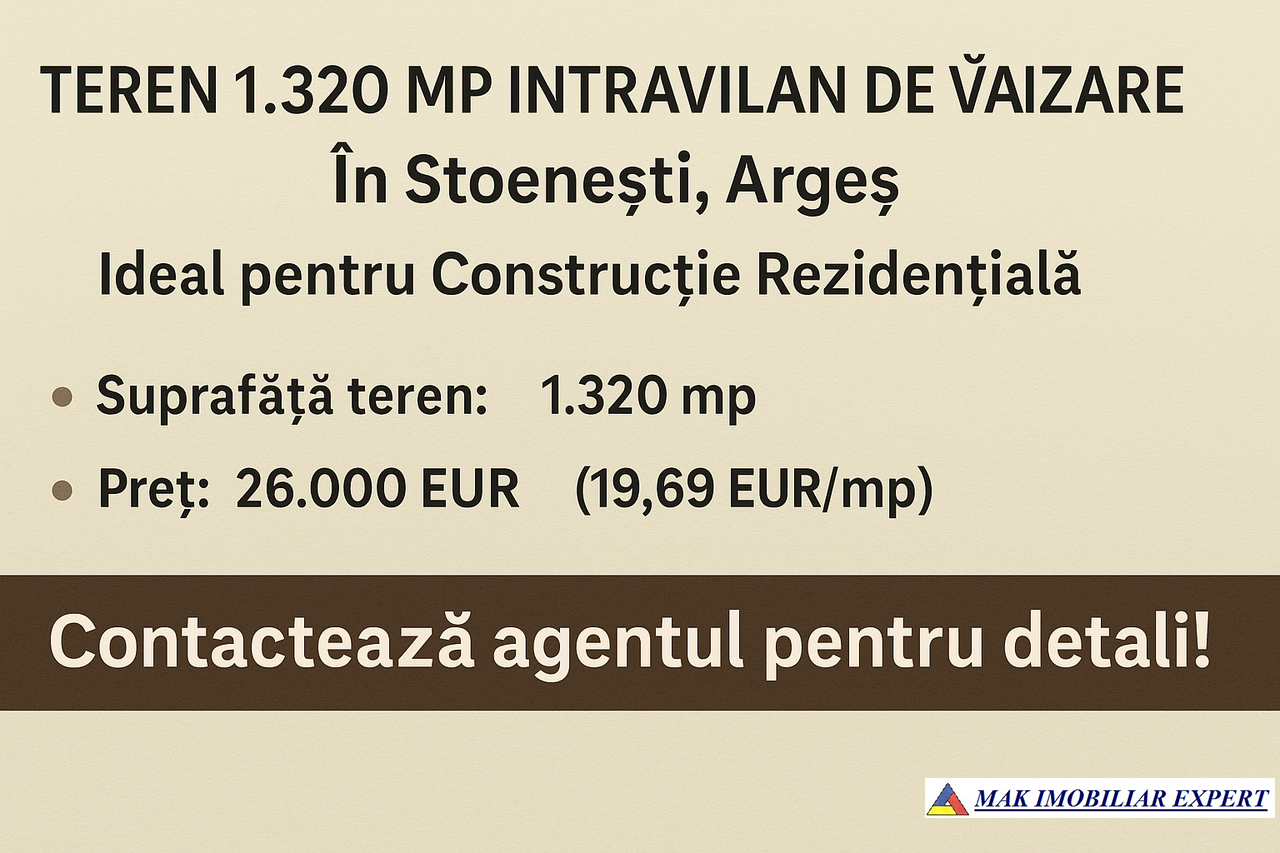 Meta Descriere: Teren intravilan de 1.320 mp, situat în Stoenești, Argeș, perfect pentru construcția unei case de vacanță sau reședințe permanente. Acces facil la utilități, într-o zonă liniștită. Preț atractiv: 26.000 EUR. Contactează agentul pentru detalii!