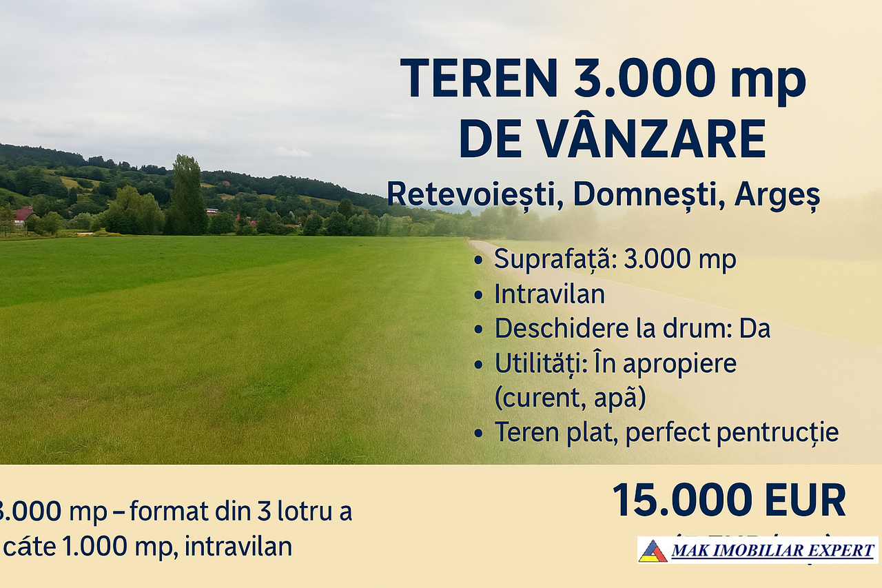 O oportunitate rară de investiție sau construcție în inima naturii! Terenul intravilan, cu o suprafață totală de 3.000 mp, este amplasat în satul Retevoiești, comuna Domnești, județul Argeș – o zonă recunoscută pentru aerul curat, liniște și peisajele pitorești.